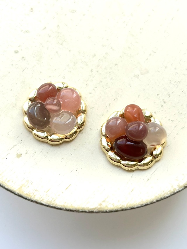 瑪瑙石をレジンで閉じ込めた、耳飾り。 ゴールド枠を使ったパイみたいなフラワーデザインのグミパイの2デザイン。 どのカラーも程よく透明感があり、くすみ系で肌馴染みが良く、大人の女性にお勧めします。 ・グミパイ サイズ 1.9cm ピアス サージカルステンレスゴールドスタッド イヤリング交換 銅製クリップ式(有料100円) 天然石ですので、一品一品色味が変わります。 ※商品説明、ショップ情報合わせて一読の上ご購入くださいますよう宜しくお願い致します。