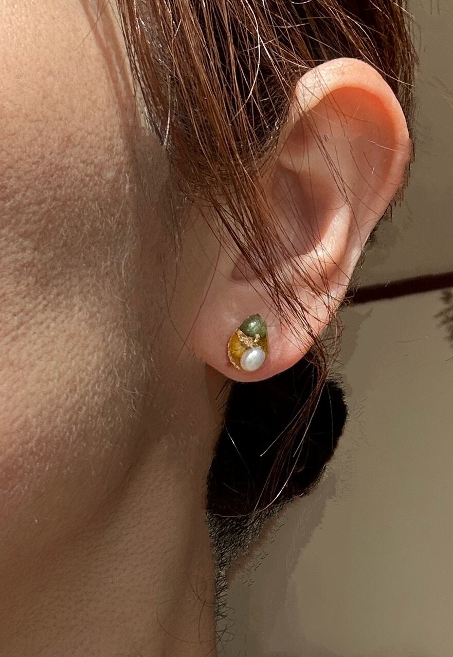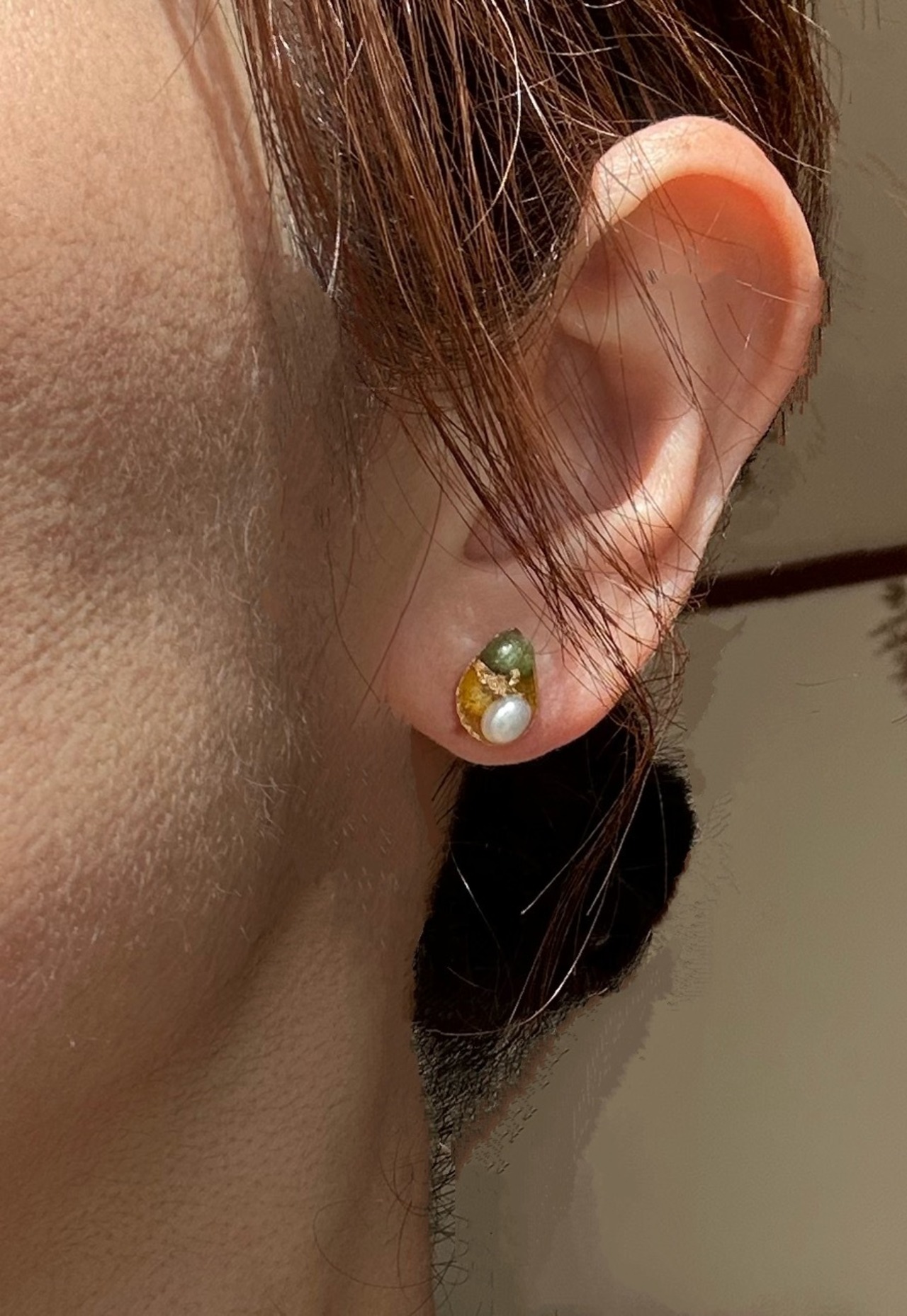 雫型の金枠にミモザの押花とトルマリン、パールを詰めた小さな耳飾りです。