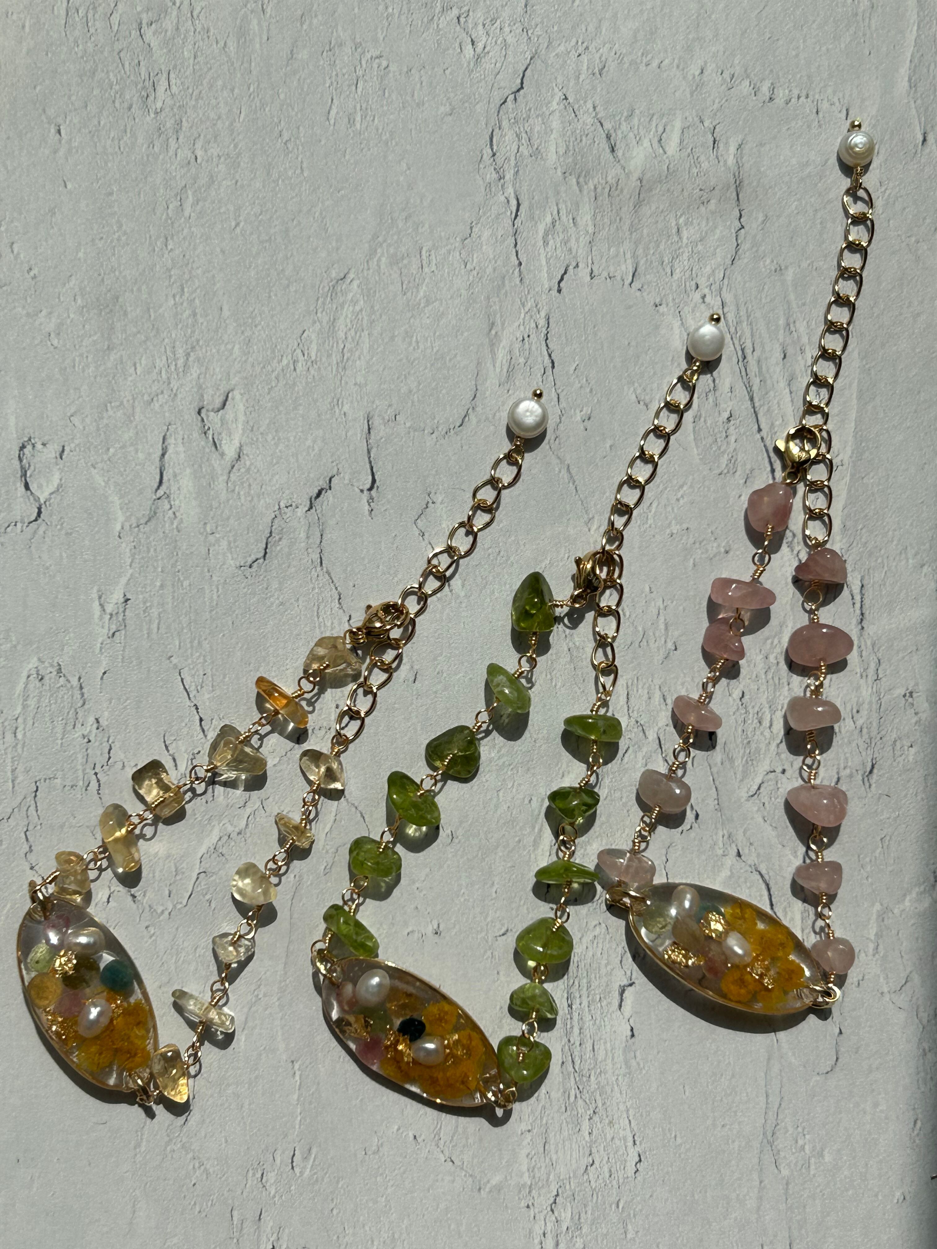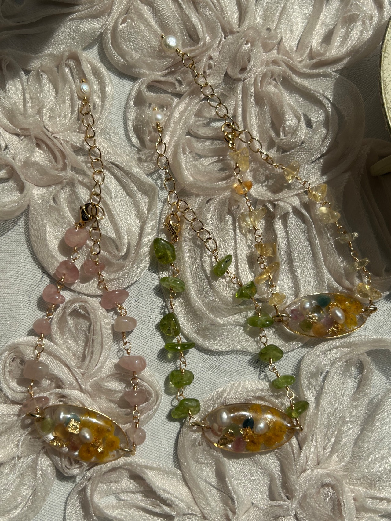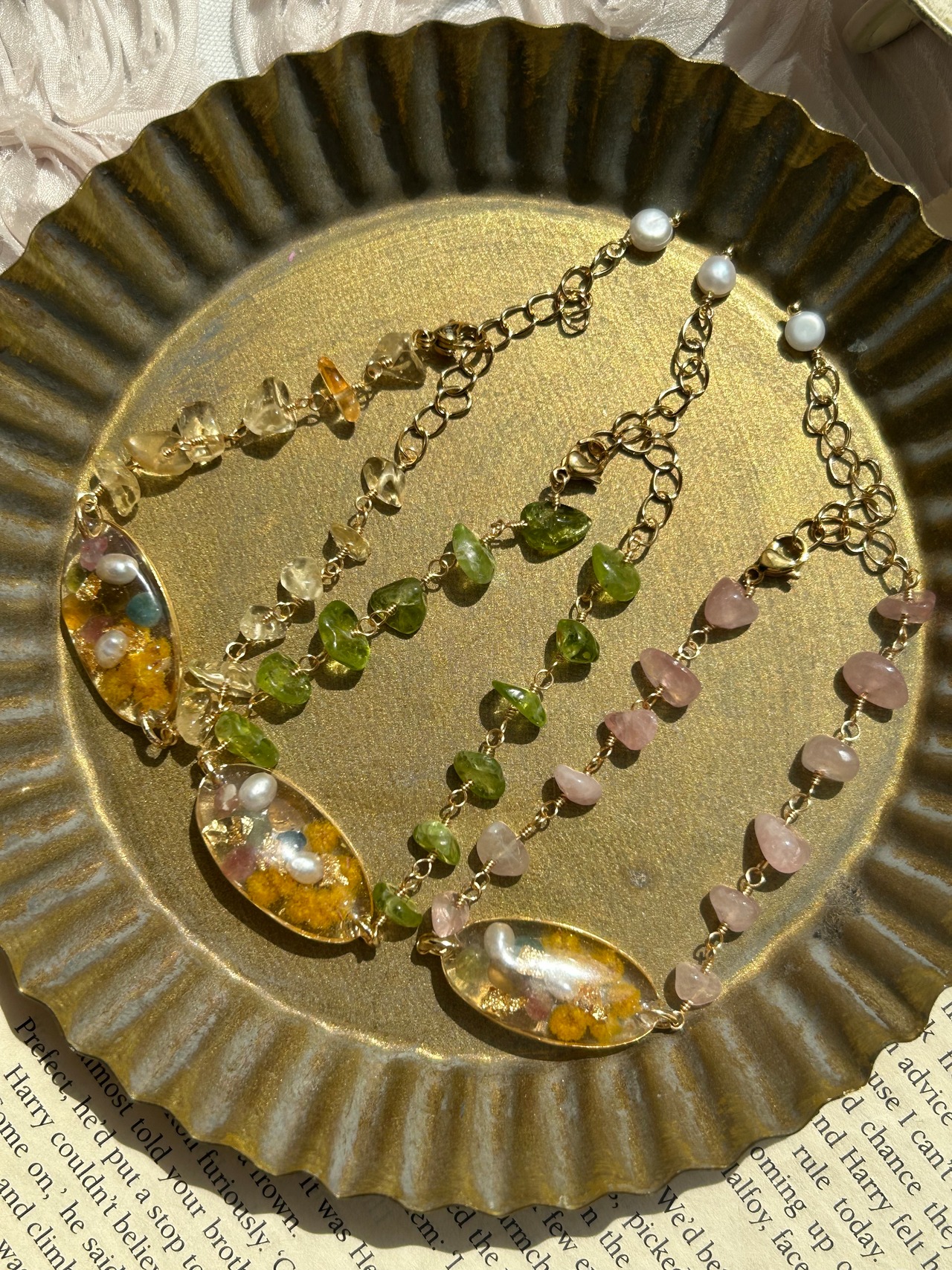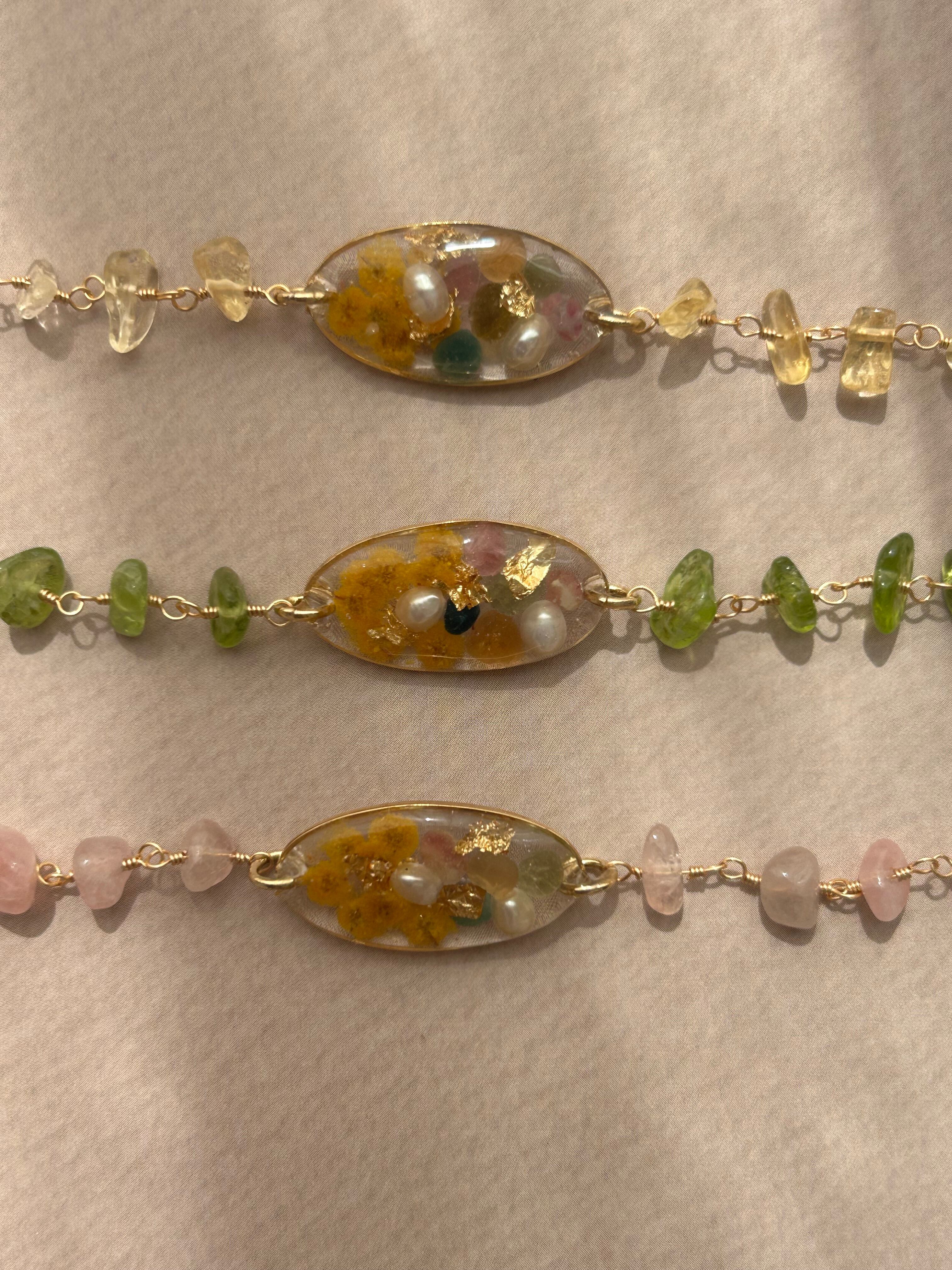 ミモザの押花と色とりどりのトルマリン、上品なパールから成る、特別な天然石ブレスです。