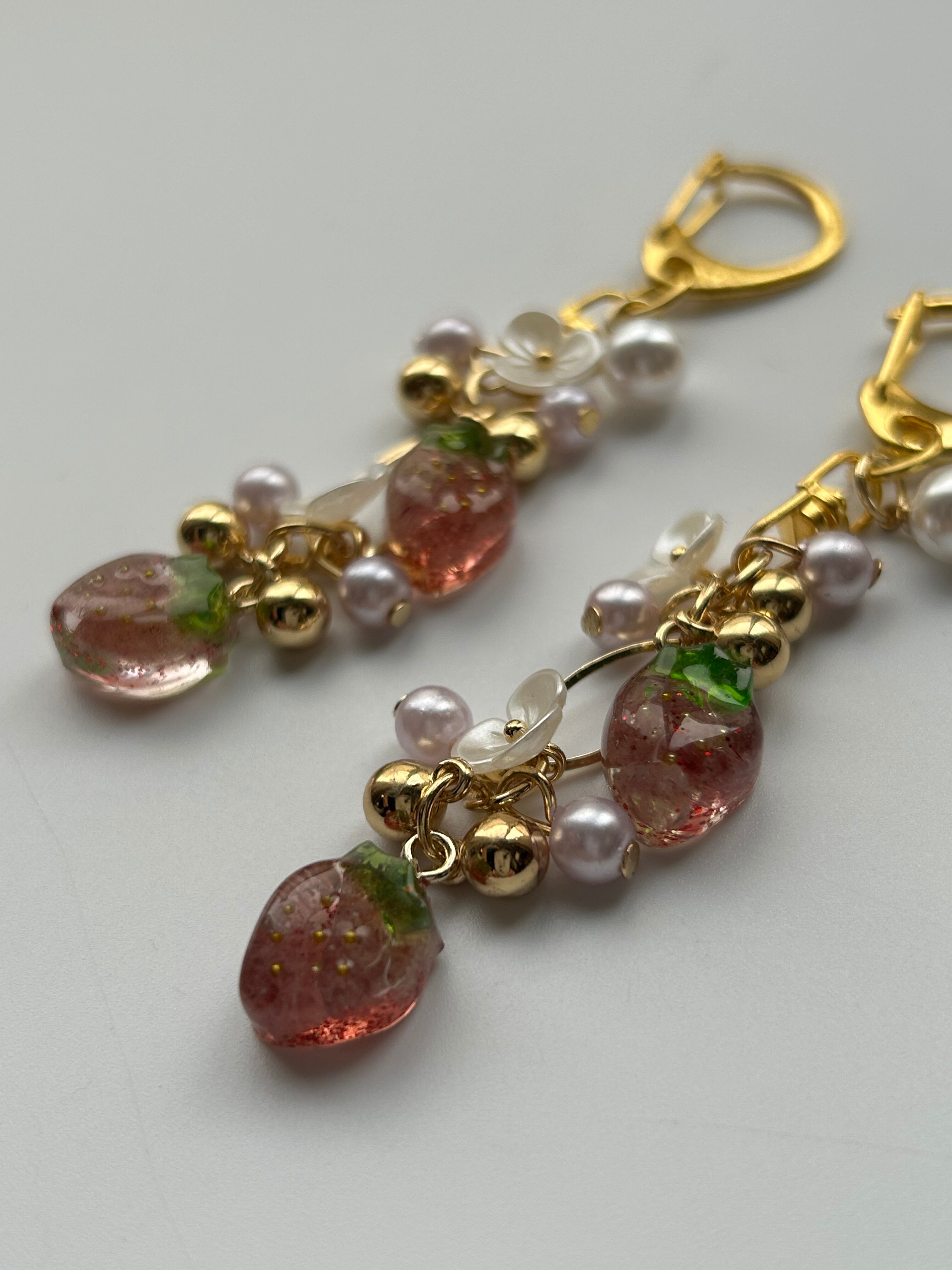 周りには、上品な輝きを放つ淡水パールやゴールドのビーズ、小さな白い花が添えられ、まるで春の果樹園をそのまま閉じ込めたような愛らしい仕上がり。