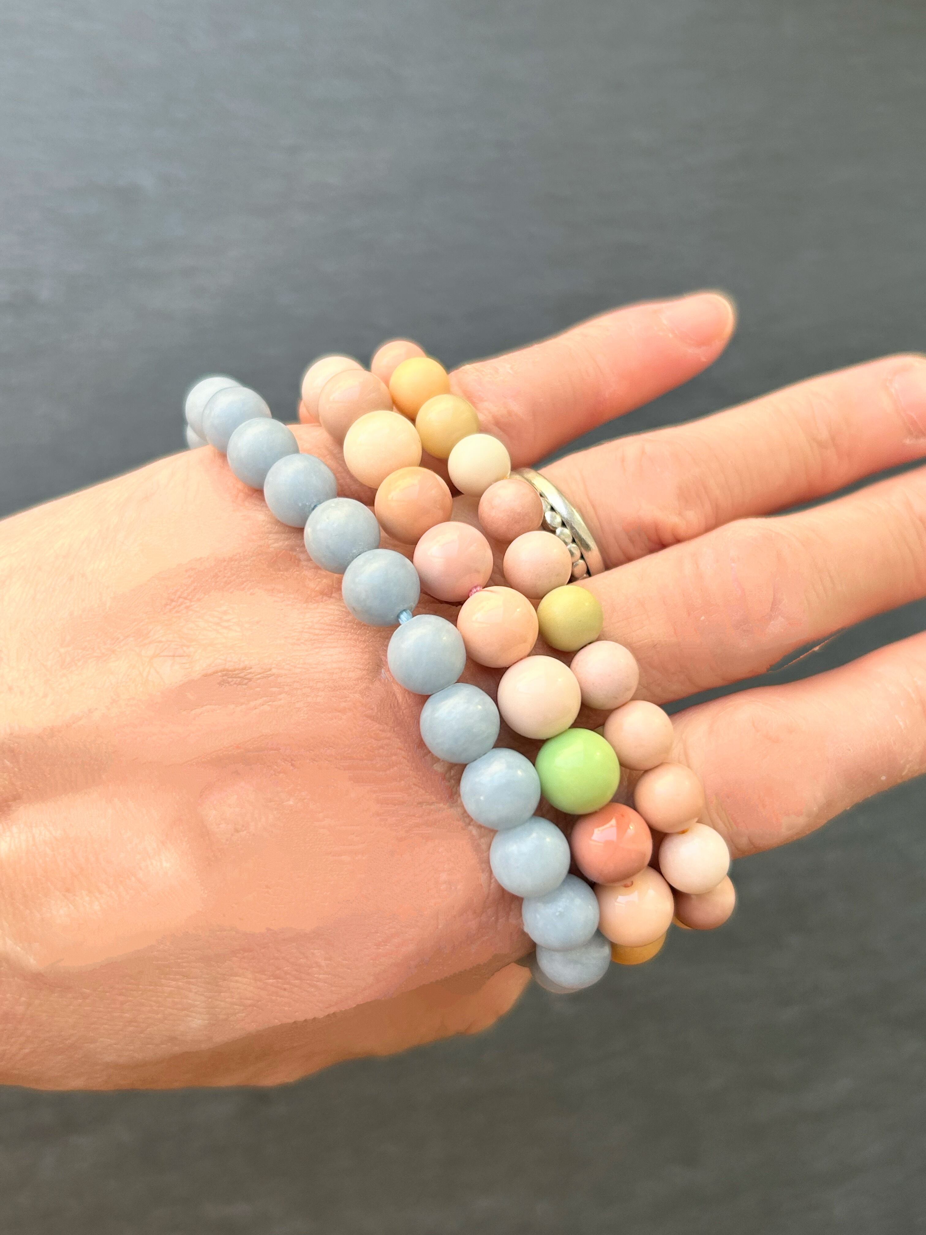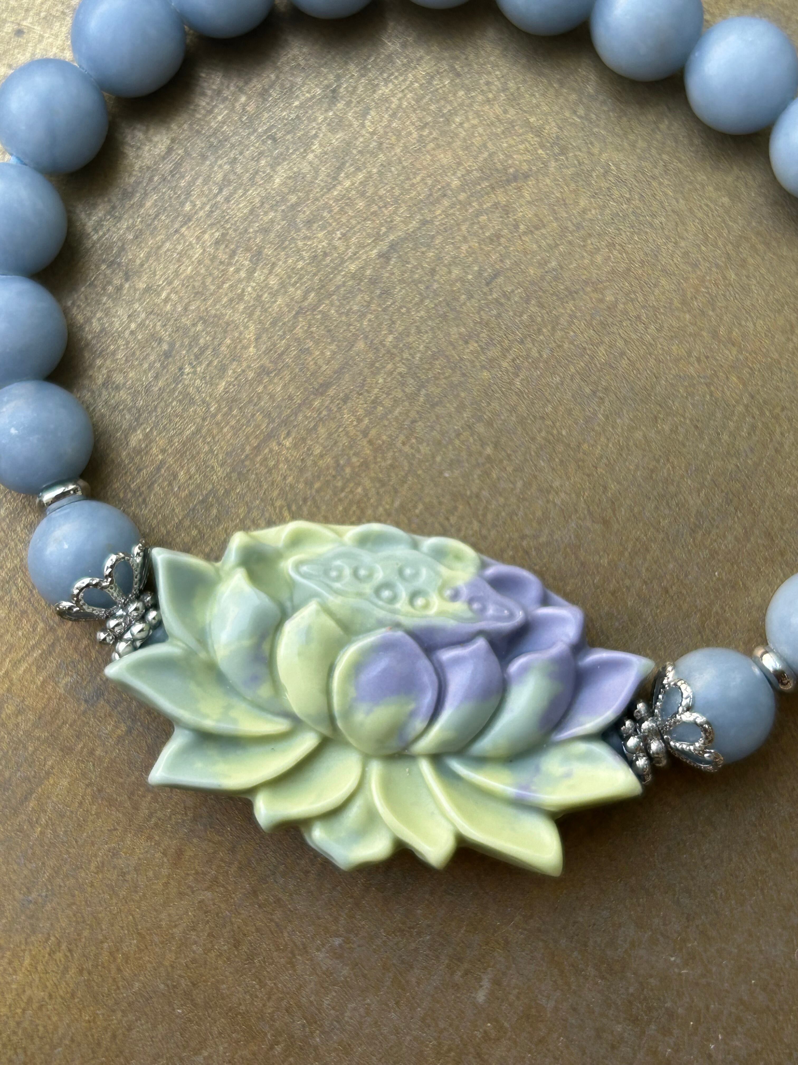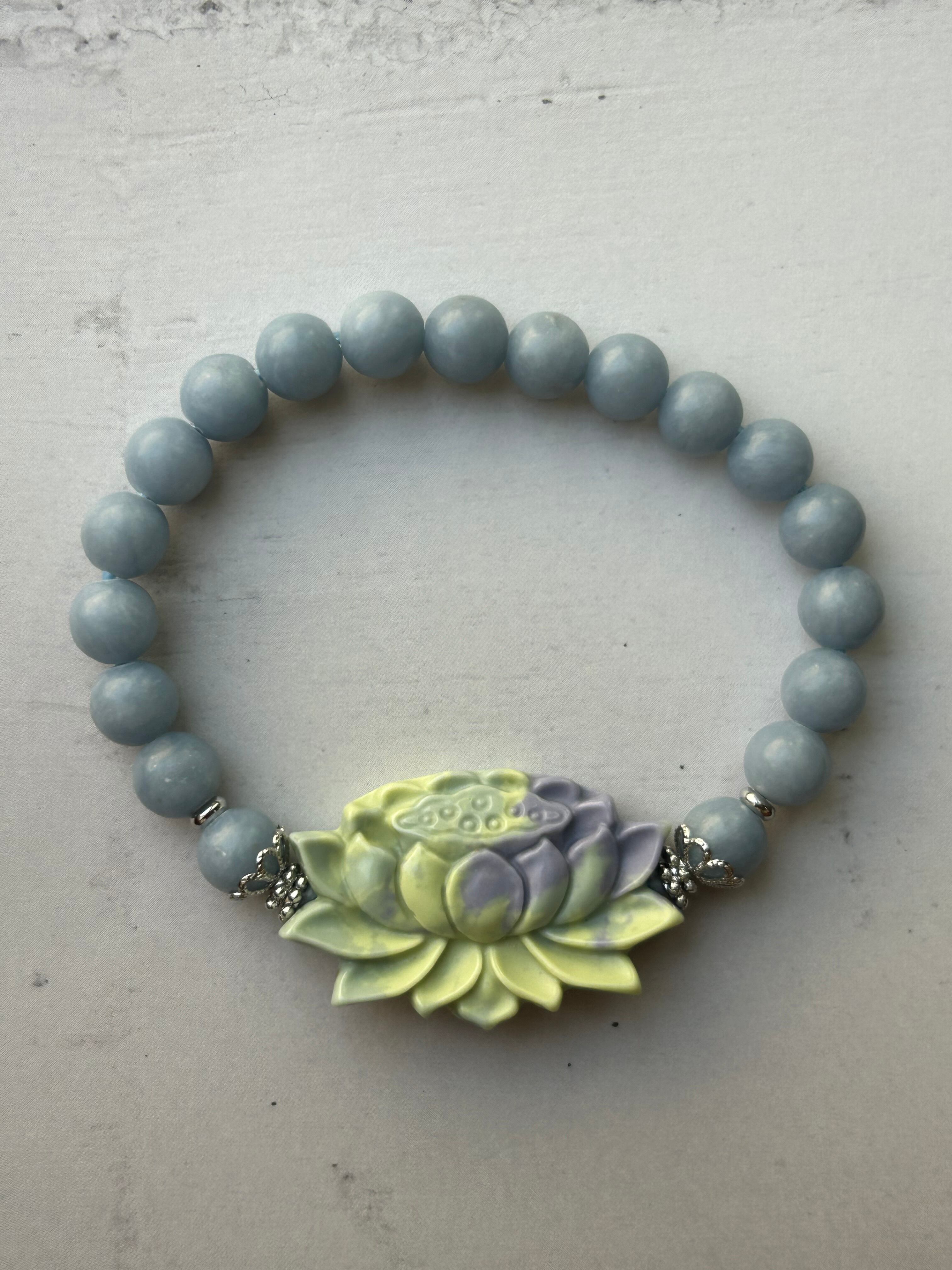 淡く心を惹きつける優しいブルーのエンジェライトに、幻想的な蓮のマカロン瑪瑙を合わせた癒しのブレスレット。
