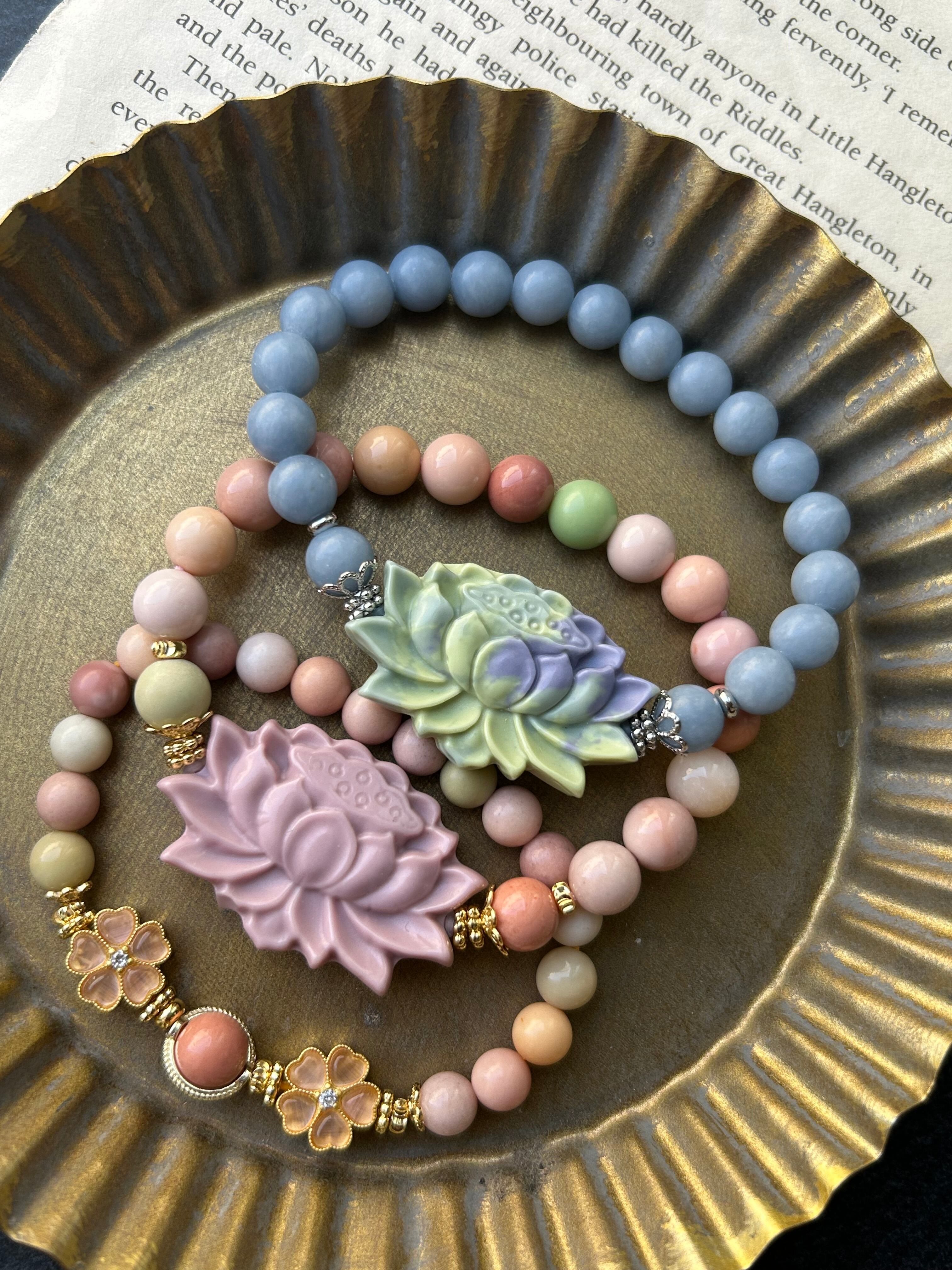 まるでマカロンのようにやさしい色とりどりの瑪瑙と、淡いピンクの優雅な蓮モチーフが印象的なブレスレット。