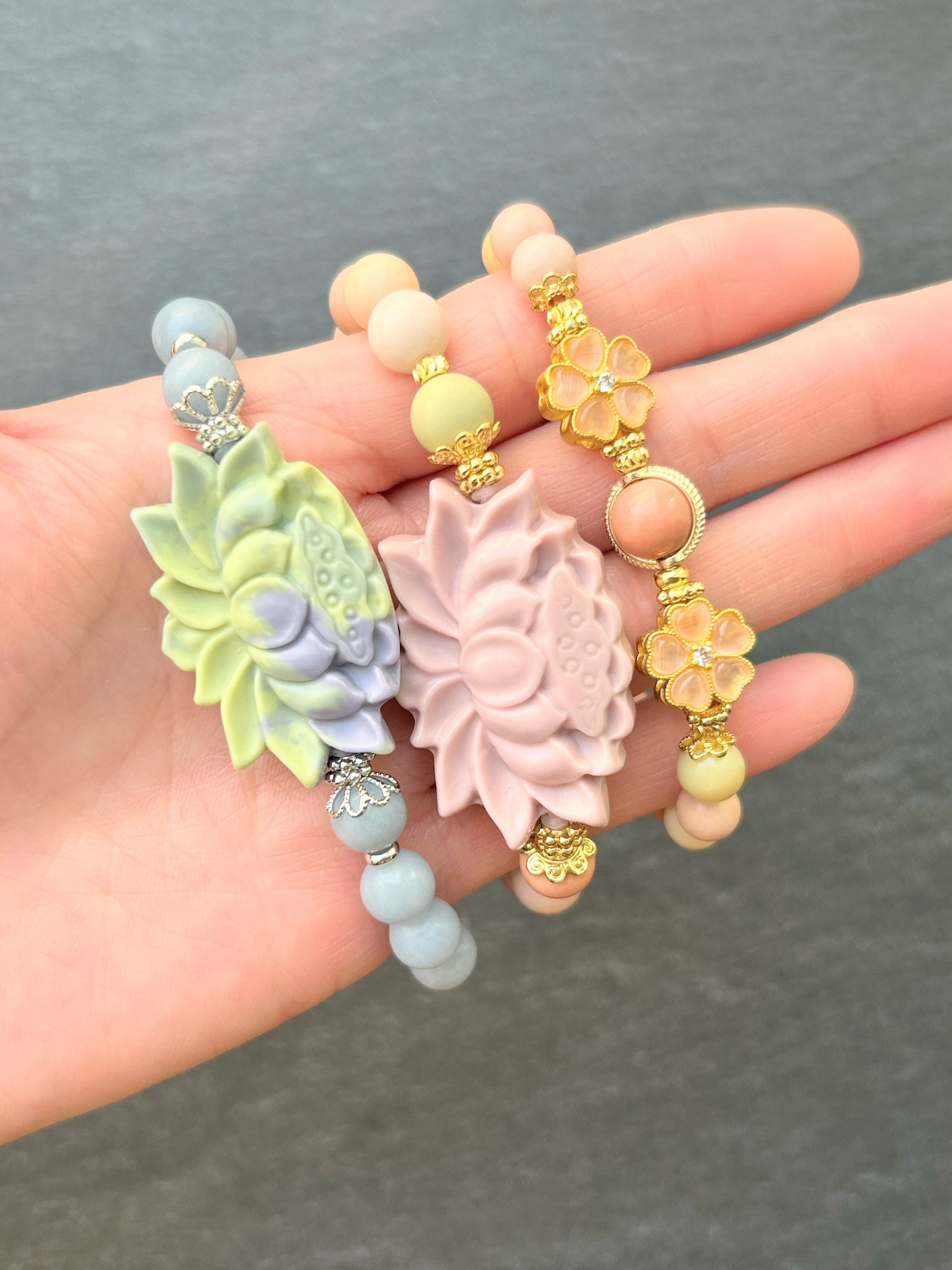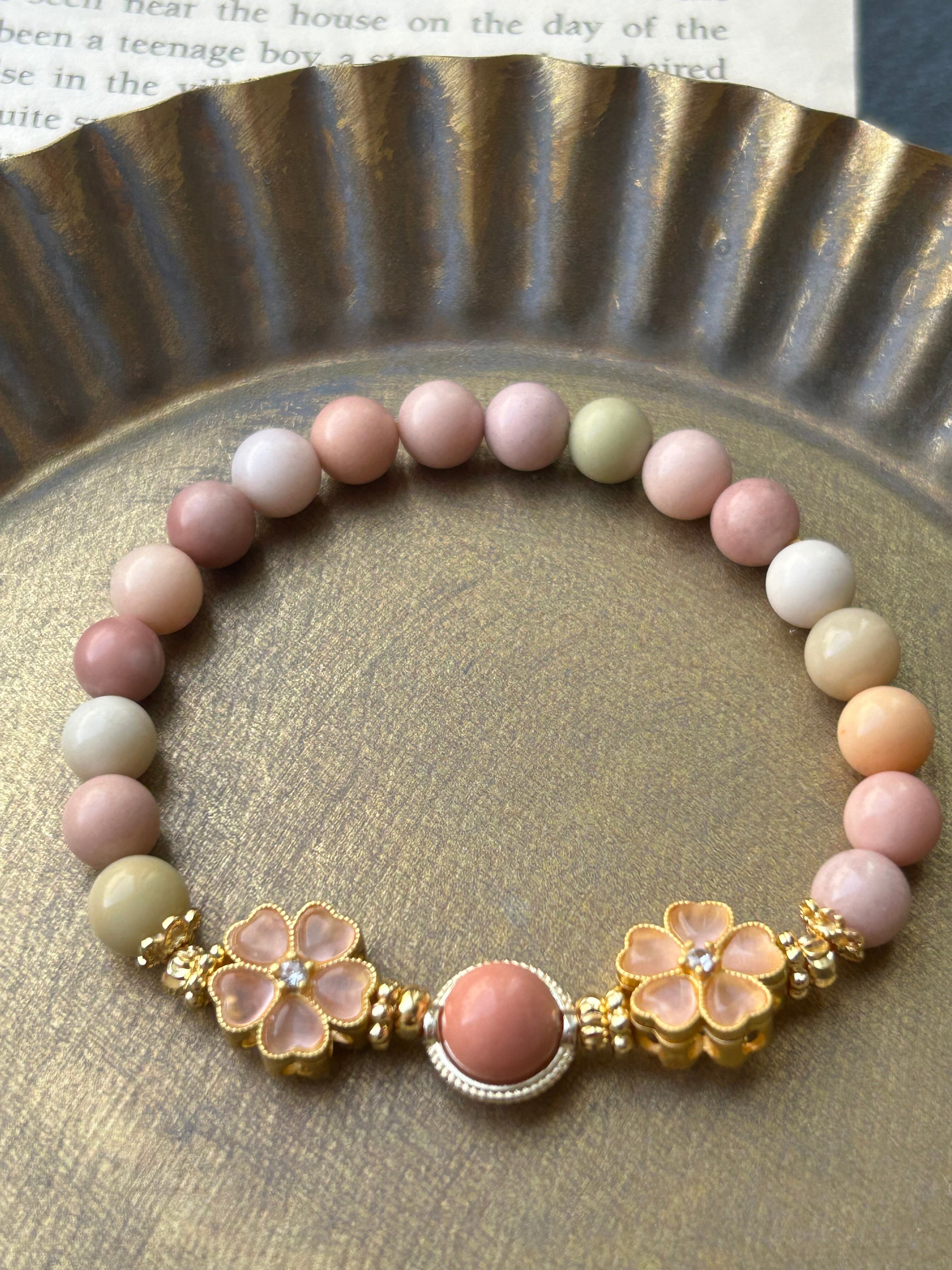 ふんわりとした色合いのマカロン瑪瑙に、可愛らしいお花のモチーフをあしらったブレスレット