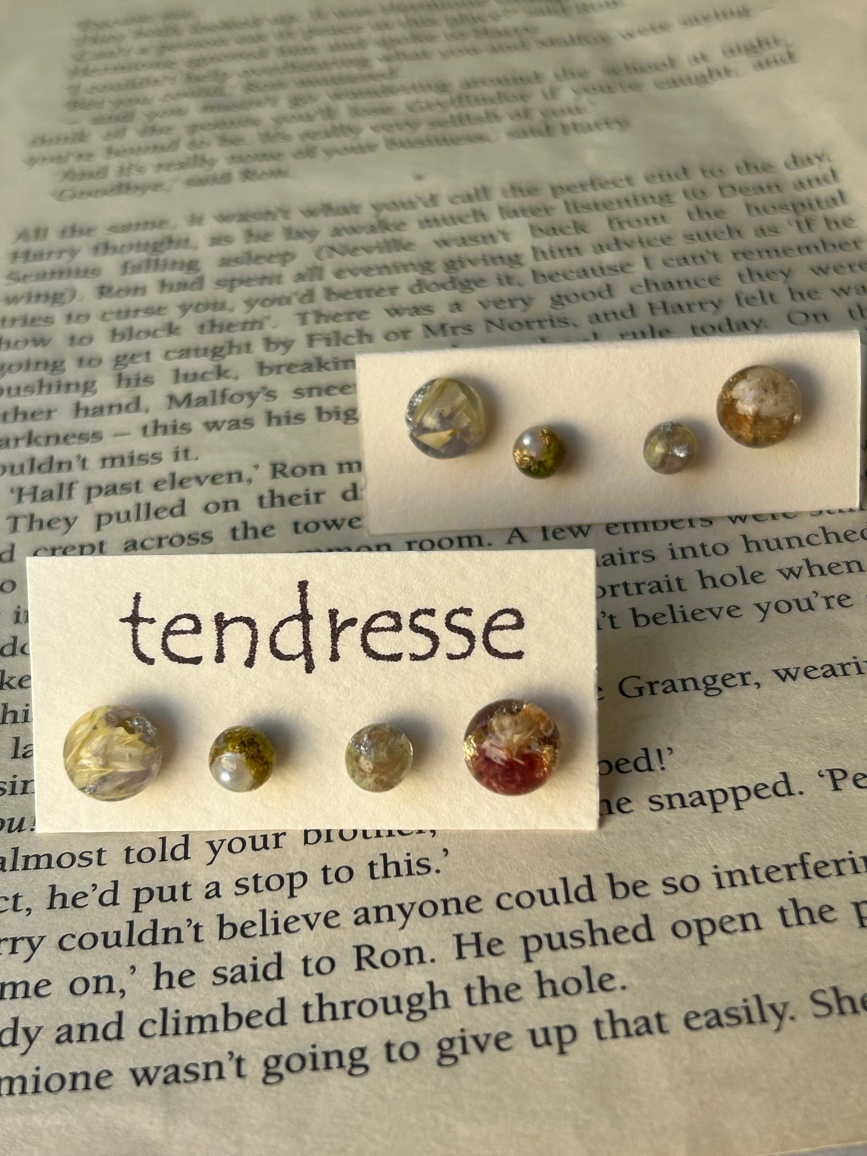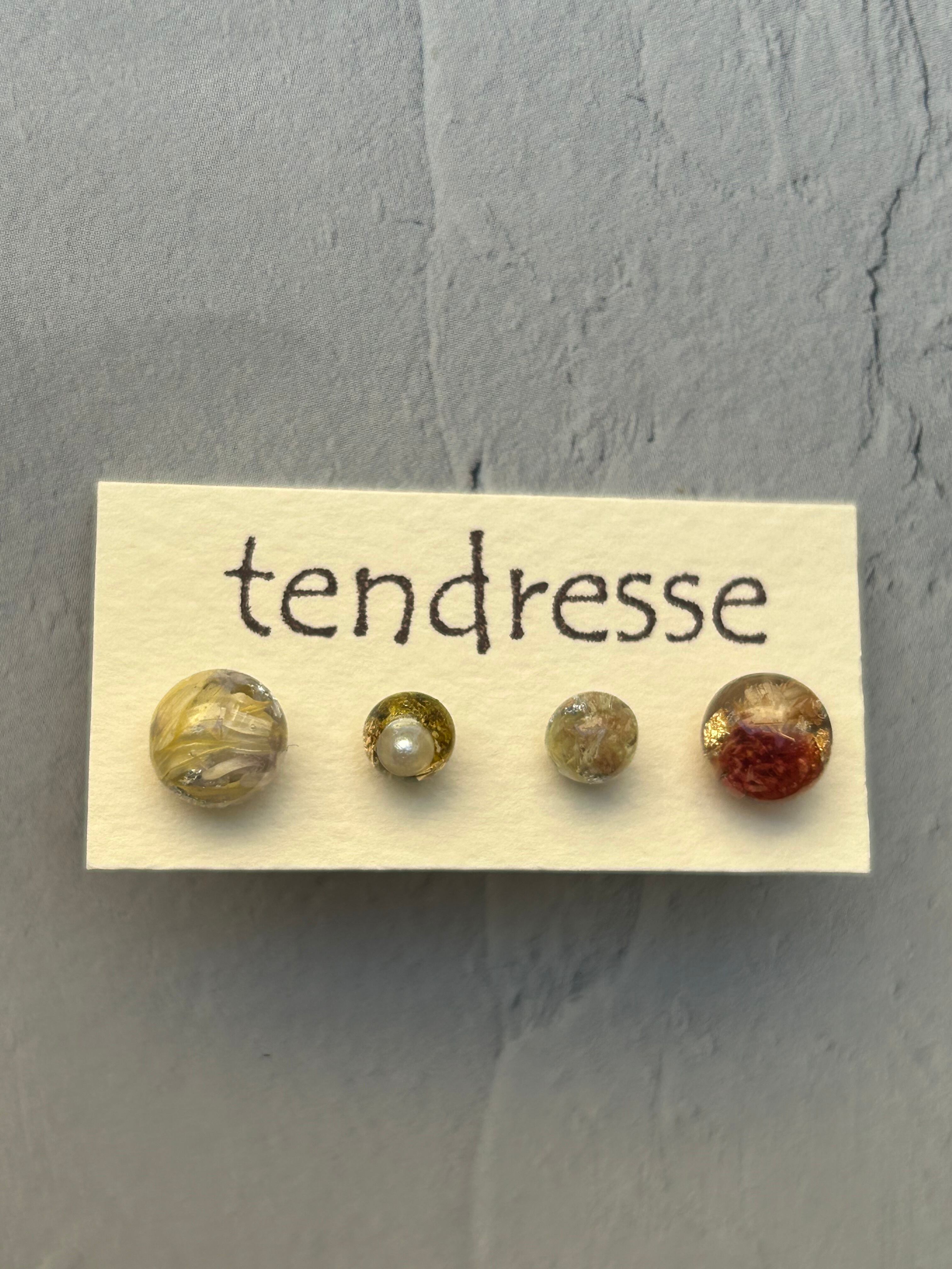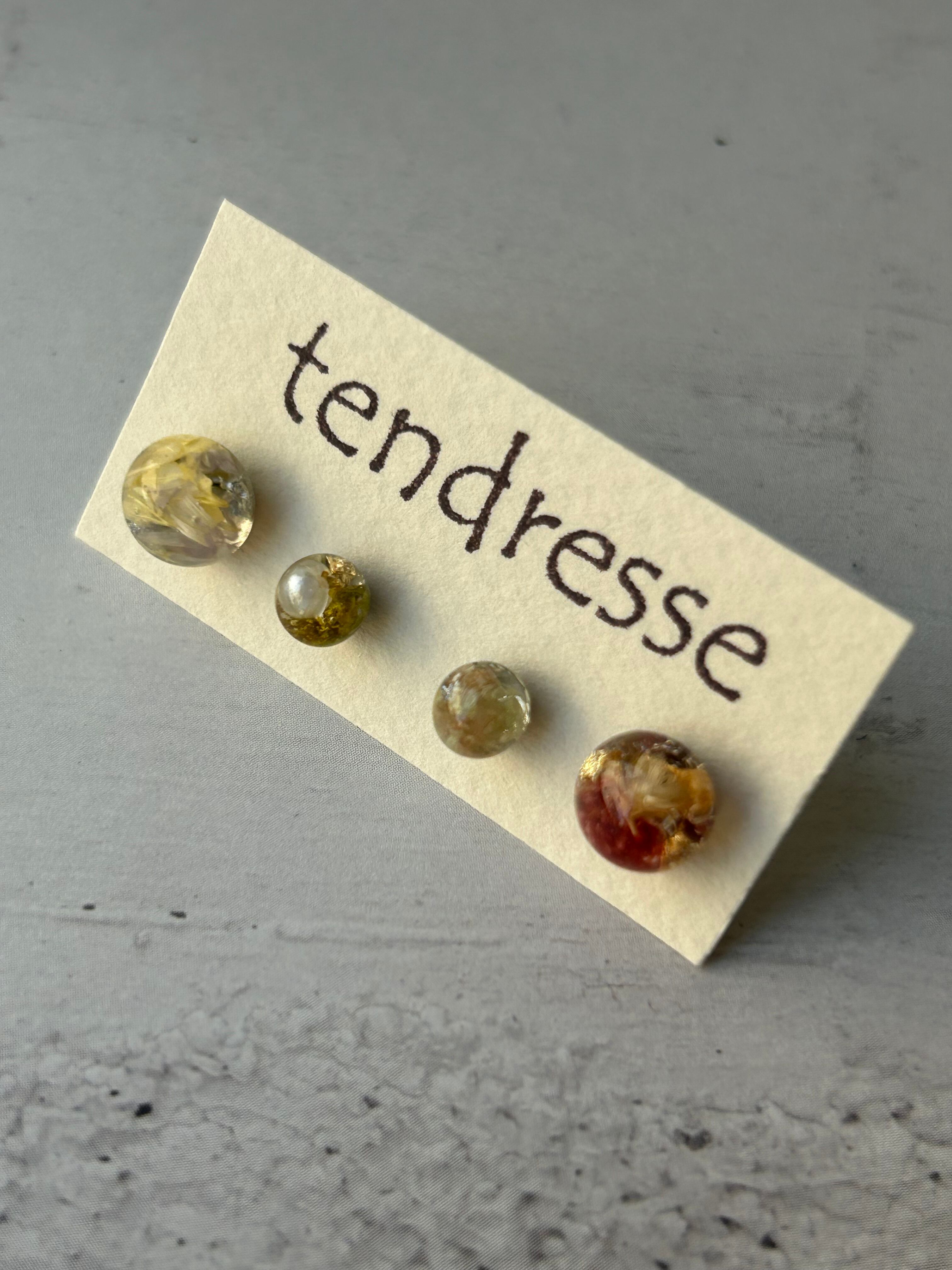 優しいカラーのお花と小粒で水滴のようなぽわんとした形が愛らしい耳飾り4点セットです。