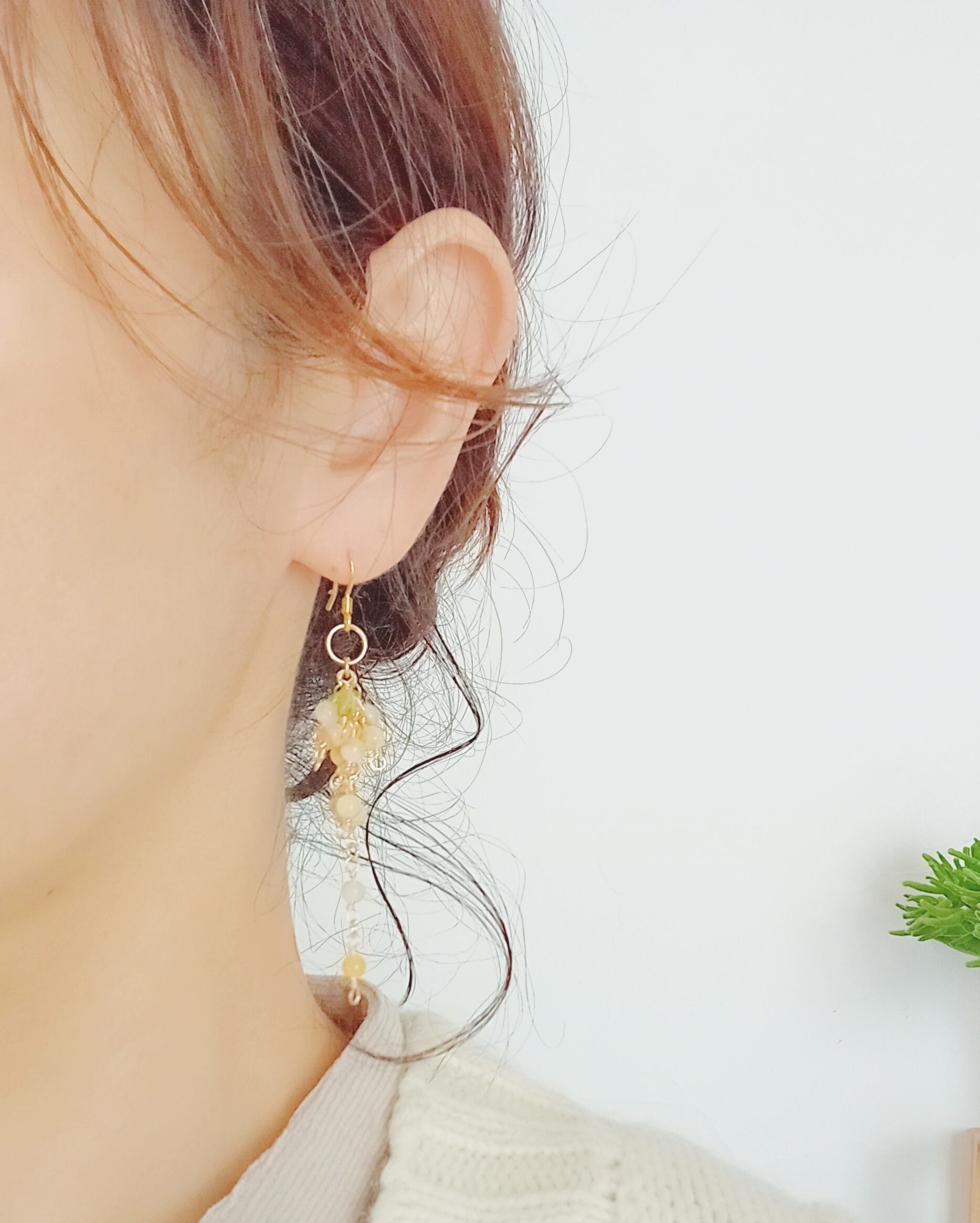 ペリドットを葉に見立てて、一つ一つ小粒のマザーオブパールをメガネ止めしたものを房のようにぶら下げました。