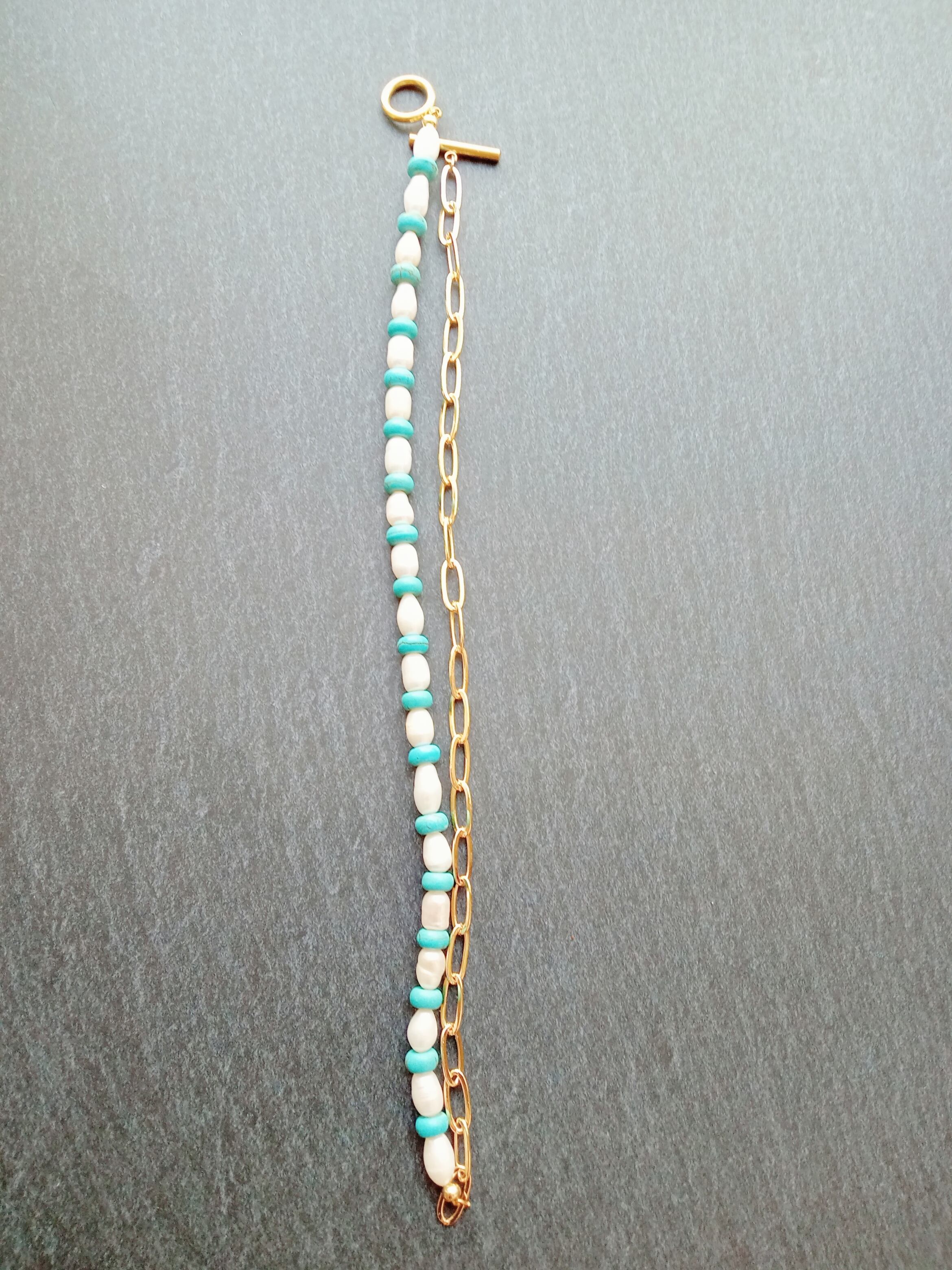 天然石ターコイズと淡水パールのチェーンマンテルネックレス