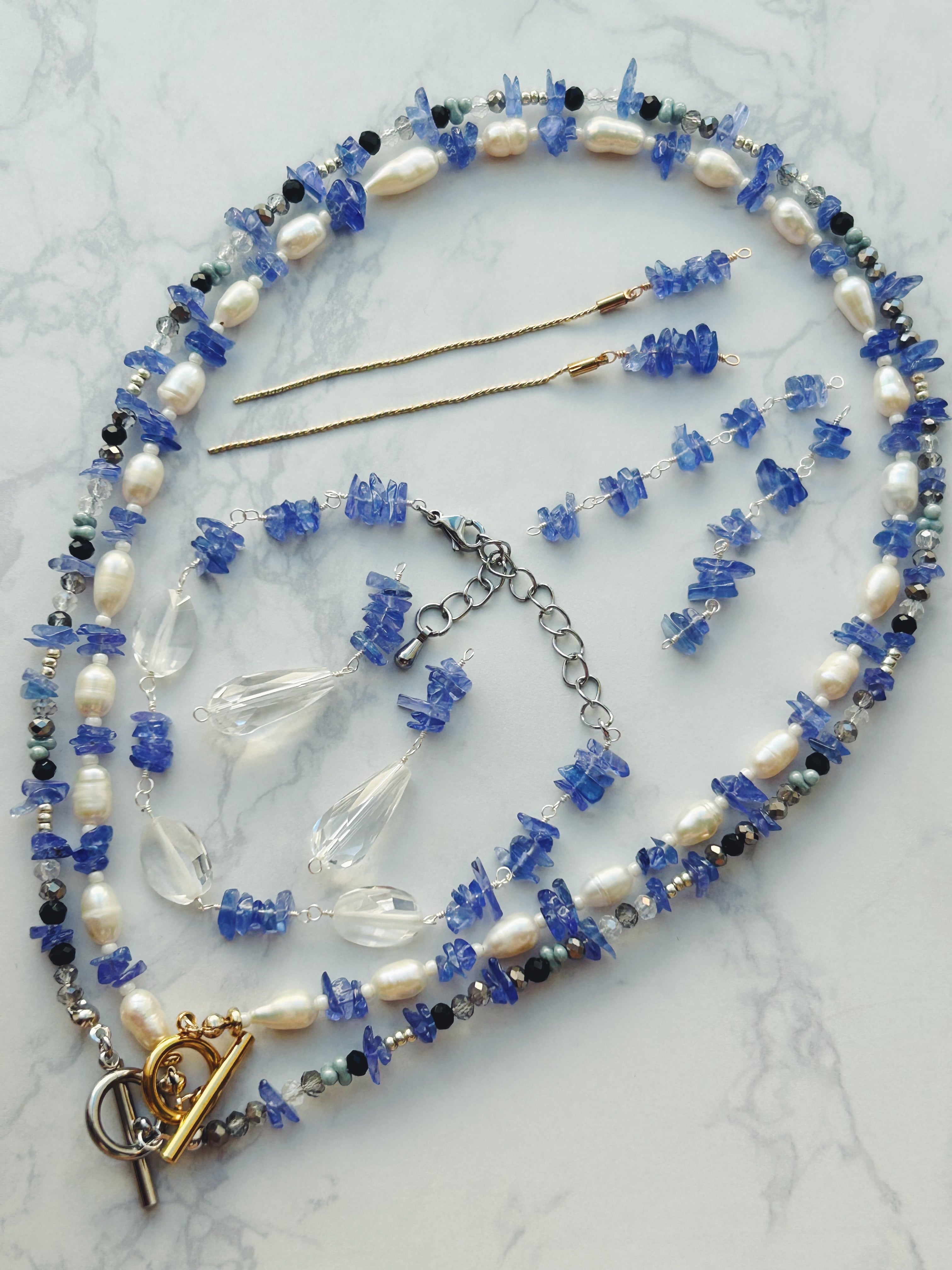 シルバーはブラックやブルーのビーズを使い、シンプルでモダンなカジュアルスタイル。
