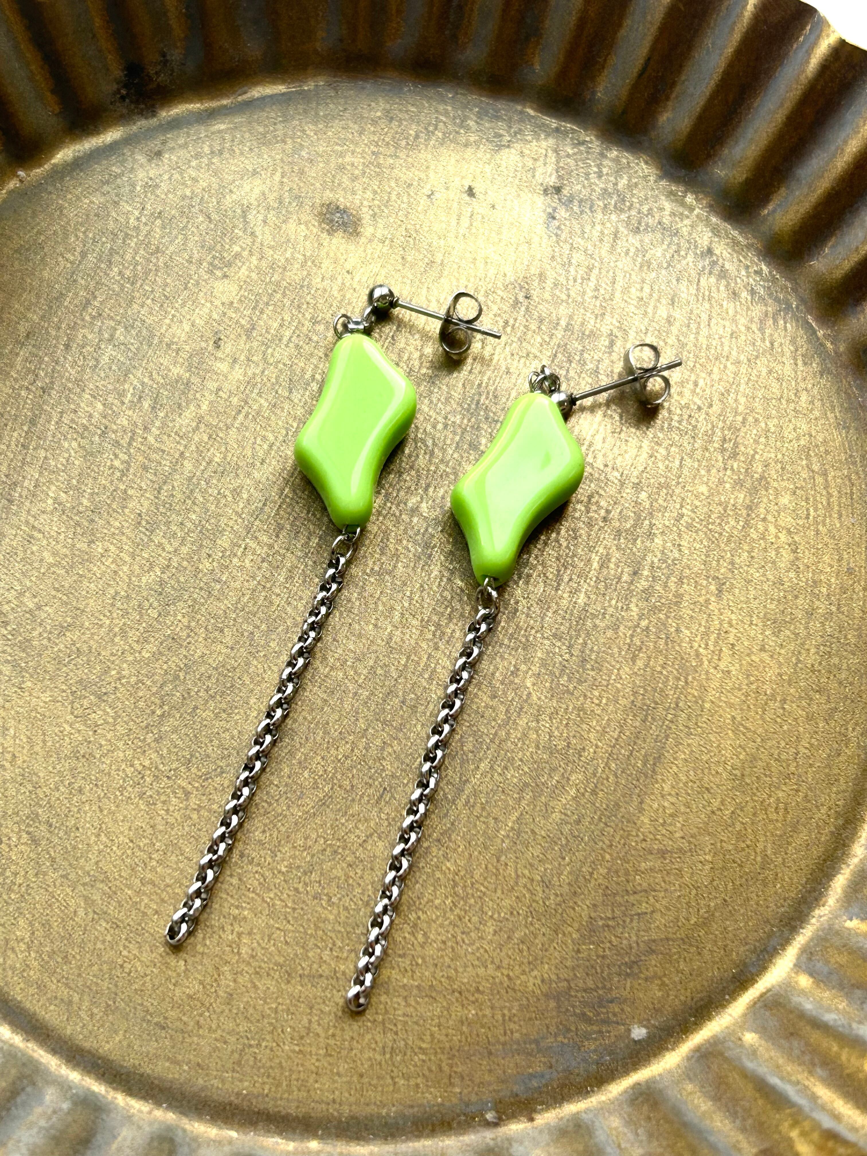 ヴィンテージのライトグリーンカーブビーズに304ステンレスチェーンを合わせたシンプルで、愛らしい耳飾り。