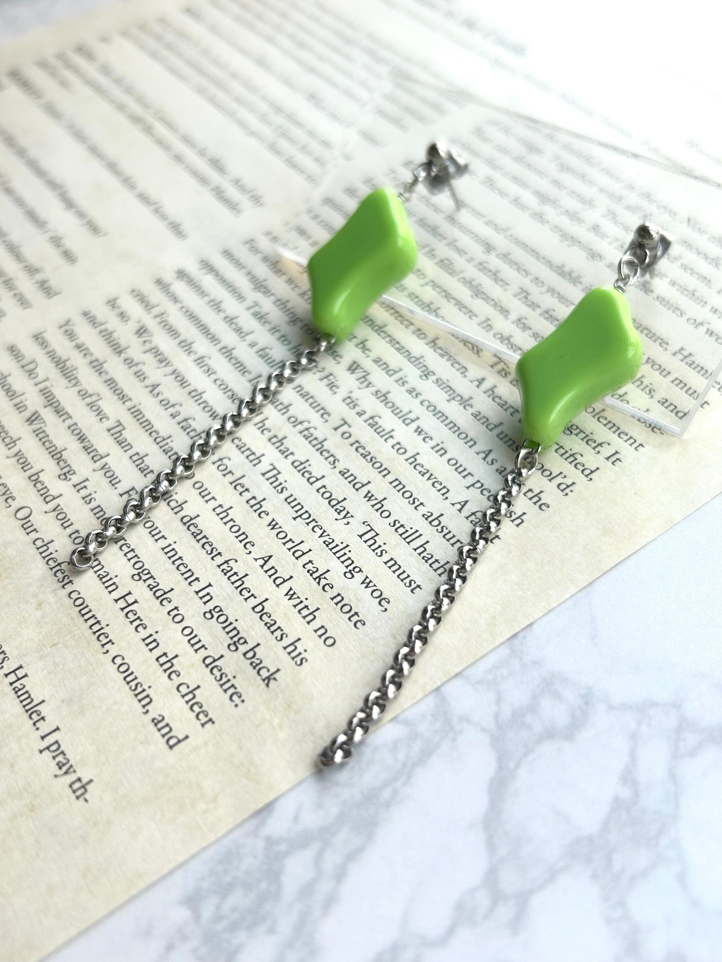 華やかなライトグリーンパーツにリングが一つ一つ繋がった2.5mmのステンレスのデザインチェーンが魅力。