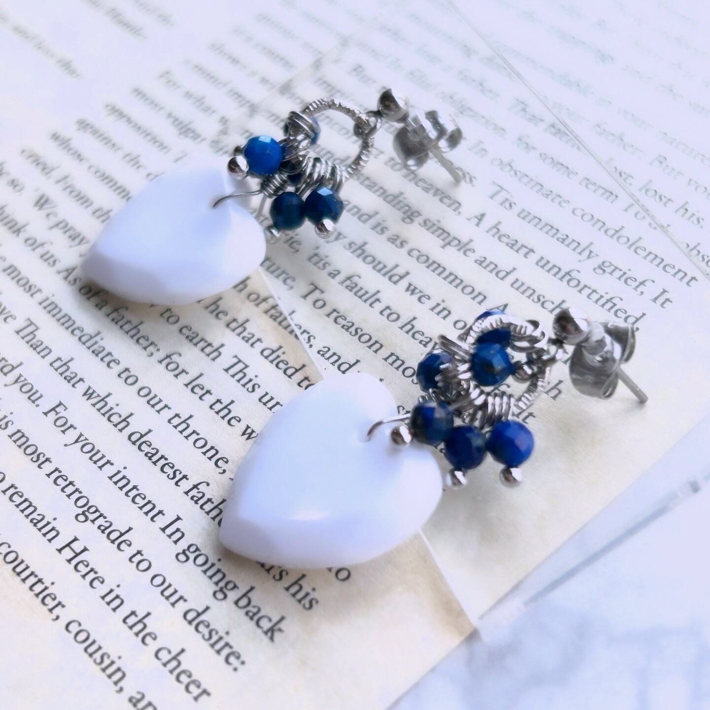ヴィンテージのホワイトハートと天然石のラピスラズリを合わせたカラーコントラストが素敵な耳飾り。