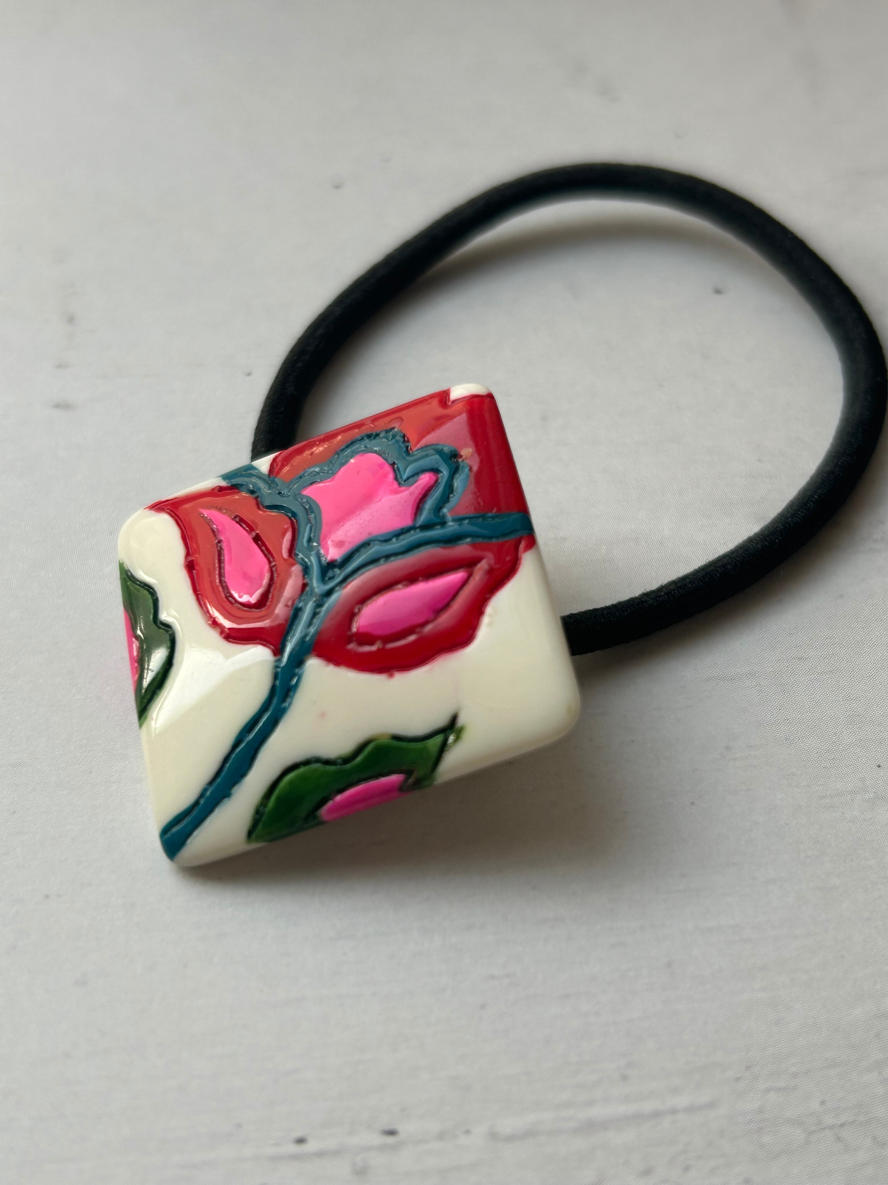 ヴィンテージパーツを使用した、鮮やかなフラワーデザインのヘアゴムです。日常使いにはもちろん、特別なシーンでもお使いいただけます。